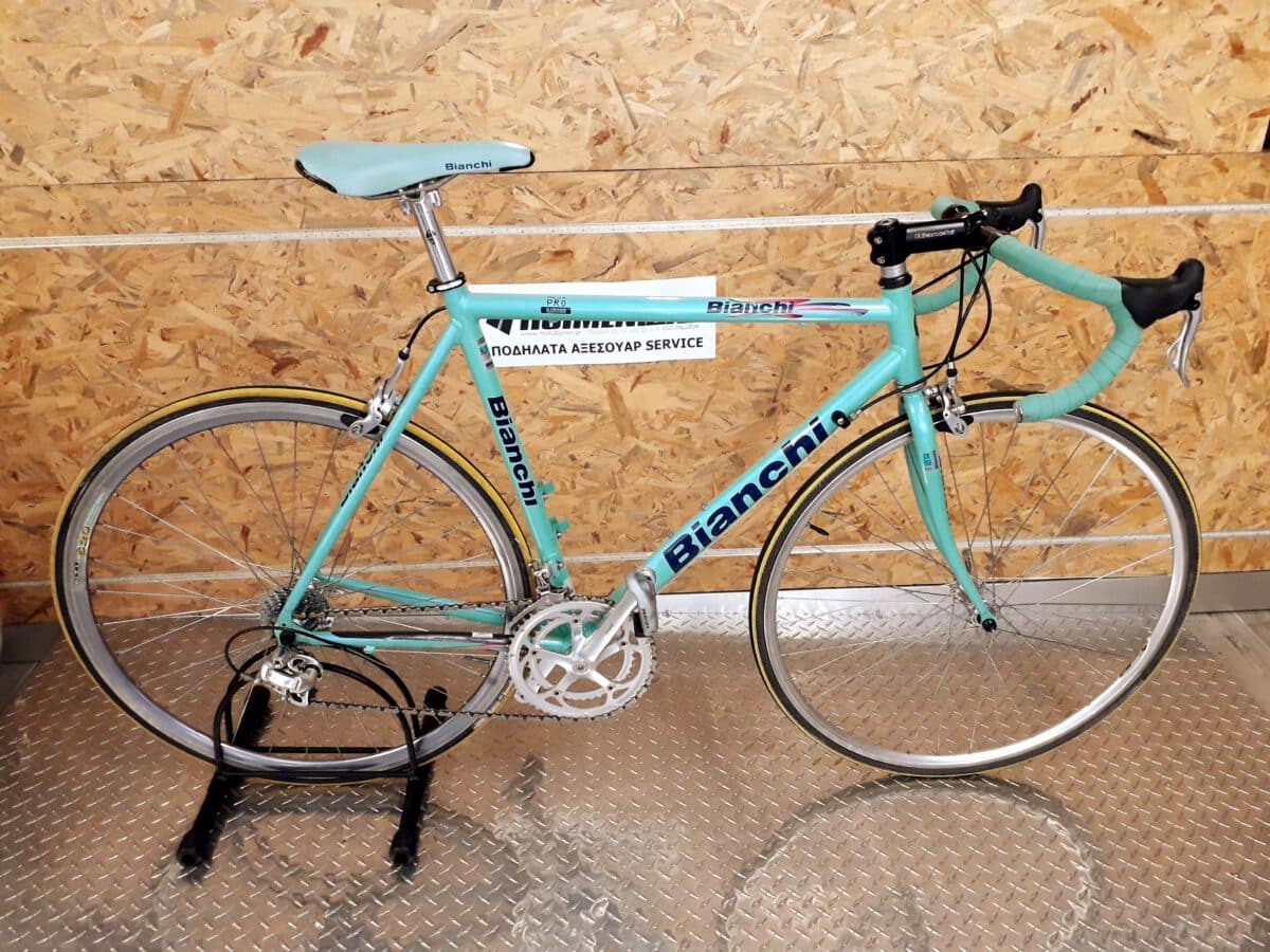 Μεταχειρισμένο ποδήλατο δρόμου Bianchi Mega Pro Reparto Corse έτους 1997 σε άριστη τεχνική και εξωτερική κατάσταση με μικρά σημάδια χρήσης, πλαίσιο 7005 Alloy , εργοστασιακό χρώμα Celeste , περιφερειακά ταχυτήτων και φρένων Campagnolo ιδανικό για αναβάτες με ύψος από 1,80 και άνω